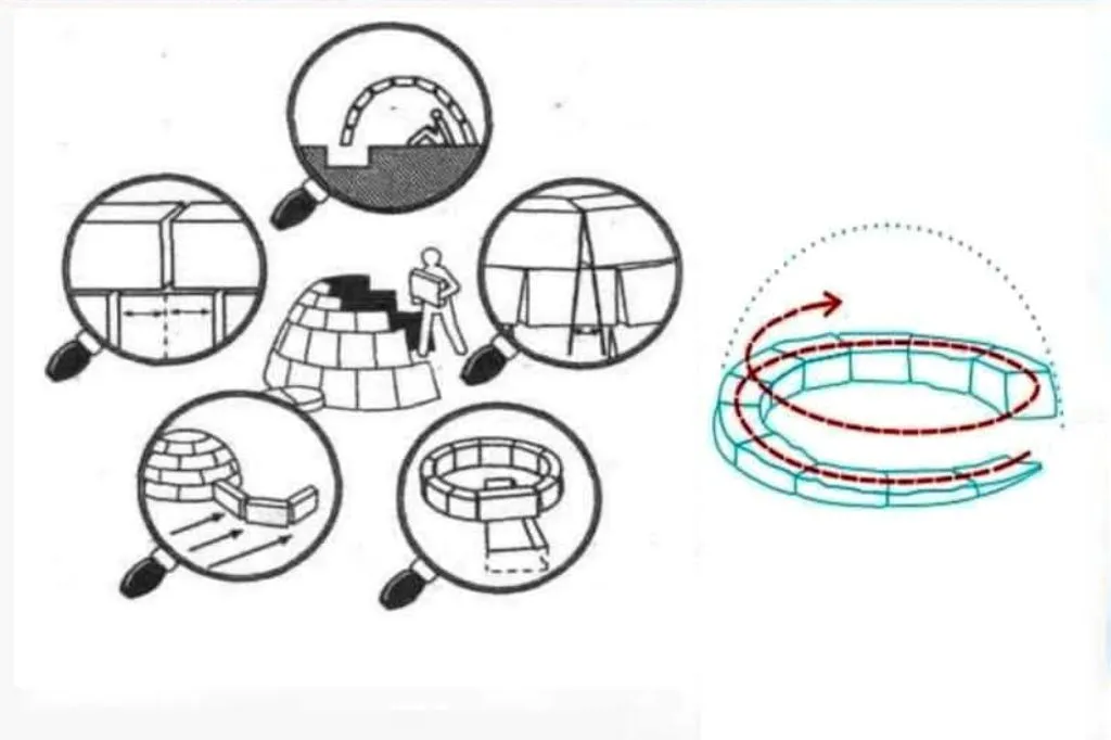 প্রথমেই বরফের ব্লকগুলোকে প্রয়োজনমতো নির্ধারিত স্থানে চক্রাকারে বসাতে হয়। গোলাকার ঘরের ভিত বা ব্লকগুলো এমনভাবে সাজাতে হবে যেন তা স্লোপের মতো করে নিচ থেকে ক্রমান্বয়ে ওপরে উঠে যাবে। একটার পর একটা ব্লক বসানোর ফলে ক্রমেই তৈরি হতে থাকে গোলাকার দেয়াল যা শেষাংশে রূপ নেয় একটি গম্বুজে। গম্বুজ আকৃতি হওয়ায় ঘর হয়ে ওঠে অত্যন্ত শক্তিশালী। তবে ঘর তৈরির বিশেষত্ব হলো, ইগলু তৈরি করা হয় সব সময় ভেতর থেকে। প্রথমে এর দরজা থাকে না, তবে ইগলু তৈরি করা শেষ হয়ে গেলে নির্মাণকারী নিচের দিকে একটা দরজা কেটে বের হয়ে আসে, যা পরবর্তী সময়ে ভেতরে যাতায়াতের জন্য ব্যবহৃত হয়। তুষারের ভেতর অসংখ্য কোটর থাকে, যেখানে বাতাস জমা হয়ে তৈরি করে জালের মতো বিস্তৃত বায়ুকোটর। এগুলো বাইরের ঠান্ডাকে সহজে ভেতরে আসতে দেয় না। ব্লক বসানোর ফলে যে ছোট ছোট ফাঁকফোকর তৈরি হয়, সেখানে তুষার লেপে বাতাস ঢোকার পথ বন্ধ করে দেয়। ইগলুর ভেতরে ঢোকার পথটি সমকোণে বাঁকানো থাকে, যেন বাতাস সরাসরি ভেতরে ঢুকতে না পারে।