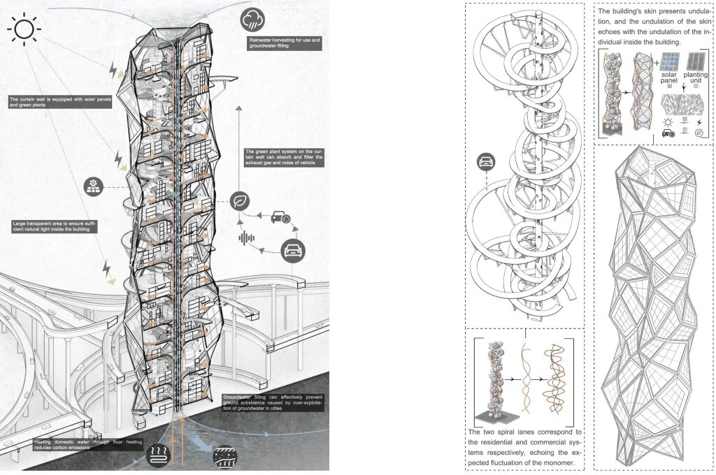 এসব প্রযুক্তি আলাদা করে যুক্ত করা হয়নি, স্থাপত্যের জেনারেটিভ লজিকের মধ্যেই অন্তর্ভুক্ত। এভাবে এটি একটি স্বনির্ভর “vertical urban ecology” তৈরি করে।
