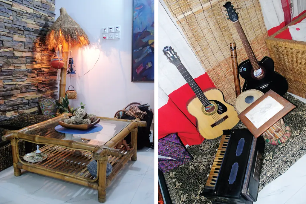 বসার ঘরে চার ডিজাইনের চার সেট সোফা। সবগুলোই হয় বাঁশ নয়তো বেতের তৈরি। একটি বক্স আকৃতির, দুটি দেখতে চেয়ারের মতো, অন্যটি প্লেট আকৃতির। সোফার সামনে চারপাশে বাঁশ দিয়ে বাঁধানো ছোট্ট একটি লো-হাইট টেবিল। সোফার উপর গাছমা দিয়ে মোড়ানো ছোট তিনটি বালিশ। পাশে রাজকীয় কারুকার্য খচিত ফ্ল্যাট বেড যার ওপরে বিভিন্ন বাদ্যযন্ত্র শোভা পাচ্ছে। বসার ঘরের মাঝামাঝি লো-হাইট বেতের বক্সের উপর টেলিভিশন সেটটি বেশ মানানসই। কারণ বসার জন্য সামনে সিঙ্গেলভাবে লো-হাইট সোফা বসানো হয়েছে। সেন্ট্রাল টেবিল মেটালের উপর কাচ দিয়ে তৈরি। এটির উপর নকশাদার কিছু শো-পিস রুমের সৌন্দর্য বৃদ্ধি করেছে। এই রুমে ছড়িয়ে-ছিটিয়ে থাকা ছোট বক্সের উপর মাটির তৈজসপত্র, টিস্যু বক্স, ফুলদানি, ছবির ফ্রেম রয়েছে। টেলিভিশনের উপরের দিকে দেয়ালের সঙ্গে লাগানো কেবিনেটে সারি সারি করে সাজানো রয়েছে বিখ্যাত এ শিল্পীর অর্জিত অ্যাওয়ার্ডগুলো। রুমের এক কোণে টবসহ একটি গাছ আর এক পাশে খড়ের তৈরি ছাতা। হাতলটি মোটা বাঁশের এবং ওই বাঁশের সঙ্গে শিকের ভেতর মাটির হাঁড়ি, হারিকেন, মাছের খালুই ও টিপ বসানো পাখা রয়েছে। দেয়ালের ফাঁকা অংশে বড় তৈলচিত্র স্থান পেয়েছে। এ কক্ষের জানালাগুলো সাদা আর লাল রঙের মিশেলে করা পর্দা দিয়ে ঢাকা। তবে পর্দার উপরে বাঁশের চটা দিয়ে বানানো মাদুর ঝোলানো হয়েছে। সঙ্গে আছে কাদামাটির তৈরি ঝাড়বাতি এবং ফ্লোরে রয়েছে বিভিন্ন রঙের পাপোশ।