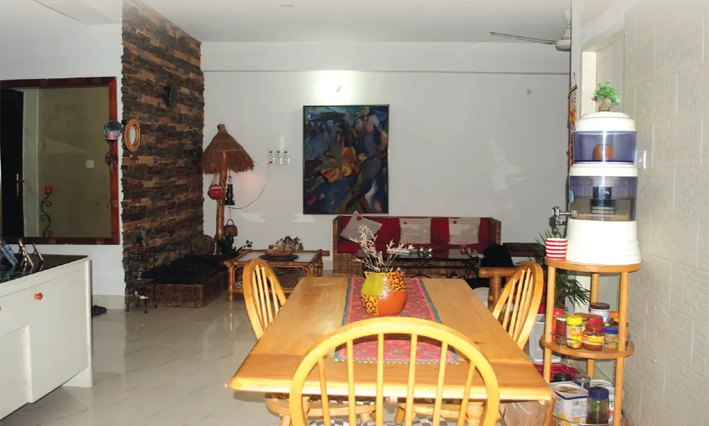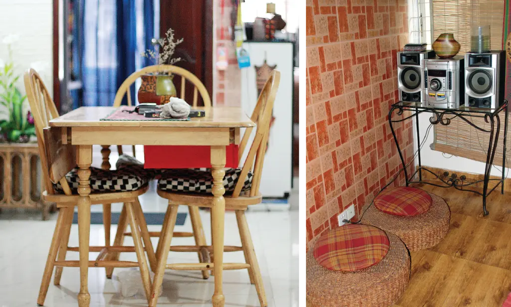 খাবার ঘরে রয়েছে কাঠের চারটি চেয়ার ও একটি চারকোনা টেবিল। তবে প্রয়োজন মতো এই টেবিল বড় করা যায়। টেবিলের উপরে মাটির তৈরি শো-পিস। চেয়ারগুলো কাঠের হলেও তার উপর সাদা-কালো কভারে মোড়ানো ফোম বিছানো। টেবিলের এক পাশে কাঠের তাক, যার উপর পানির ফিল্টার। আর প্রতিটি তাকে রয়েছে বিভিন্ন আচার ও মসলাজাতীয় দ্রব্য। আর দেয়ালের বিভিন্ন জায়গায় শিকেয় ঝোলানো মাটির নানান উপকরণ। এমনকি প্রতিটি রুমে ঢোকার স্থলেও মাটির নকশাদার শো-পিস ঝোলানো রয়েছে। রান্নাঘর থেকে খাবার ঘরে ঢোকার দরজায় একটি টেলিফোন সেট ঝোলানো, আর ফ্লোরে রাখা একটি লতা-পাতার আদলে নকশা করা ল্যাম্পপোস্ট।