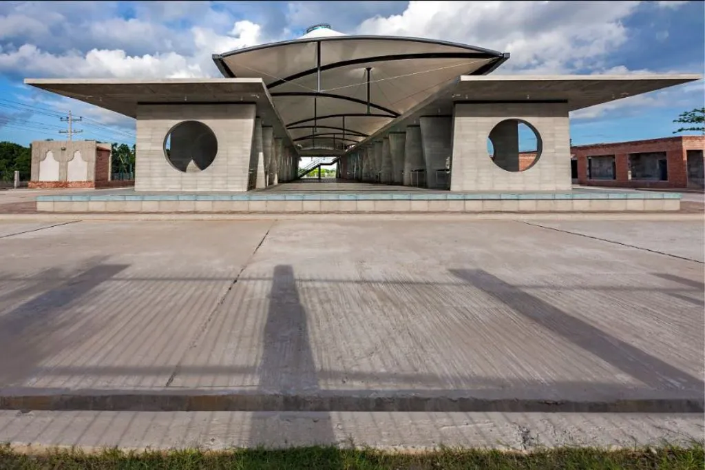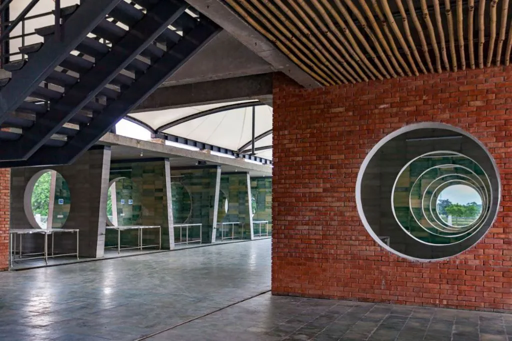 কমপ্লেক্সের উত্তর-পূর্ব পাশ দিয়ে চলে যাওয়া আঞ্চলিক মহাসড়ক থেকে দর্শনার্থী পথ দিয়ে পায়ে হেঁটে ভেতরে ঢুকলেই শুরুতে স্বাগত জানাতে রয়েছে এর প্রধান প্রবেশদ্বার। স্থানিক বৈশিষ্ট্যের বেশ চমৎকার প্রদর্শনী ফুটে উঠেছে এই প্রবেশদ্বারে। দুই পাশে লাল ইটের দেয়ালে নকশিকাঁথার আবহ আর তার মাঝে স্থানীয় বাঁশের পরিচ্ছেদ। বাঁশ দিয়ে জালিসদৃশ দেয়াল তৈরি করেছেন, যা একই সঙ্গে দৃশ্য সংযোগ তৈরি করছে আবার কৃষকের উঠোনে থাকা অকৃত্রিম উপাদানকে বিশ্ববাসীর সামনে উপস্থাপন করছে। টেকসই, পরিবেশবান্ধব, সহজলভ্য ও স্থানীয় উপাদানের ব্যবহার এই প্রকল্পের আরেকটি গুরুত্বপূর্ণ দিক। নির্দিষ্ট কিছু এলাকা ব্যতীত পুরো কমপ্লেক্সের কাঠামো ইটের দেয়ালে তৈরি। স্থানীয়ভাবে তৈরি ইটের অবিকল অবয়ব দৃশ্যমান। দেয়াল ও মেঝেতে ব্যবহার করা সিমেন্ট টাইলসও পুরোপুরি স্থানীয়ভাবে প্রস্তুতকৃত। বিভিন্ন পরিসরের বৈচিত্র্যকে ফুটিয়ে তুলতে টাইলসের অবস্থানভেদে নীলাভ, সবুজাভ ও ধূসর রঙের প্রলেপ দেওয়া হয়েছে।