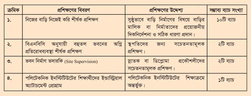 - নির্মাণ ক্ষেত্রে সঠিক মান সংরক্ষণের উদ্দেশ্যে প্রয়োজনীয় মান নিয়ন্ত্রণের ব্যবস্থা প্রচলনের উদ্যোগ গ্রহণ করা।